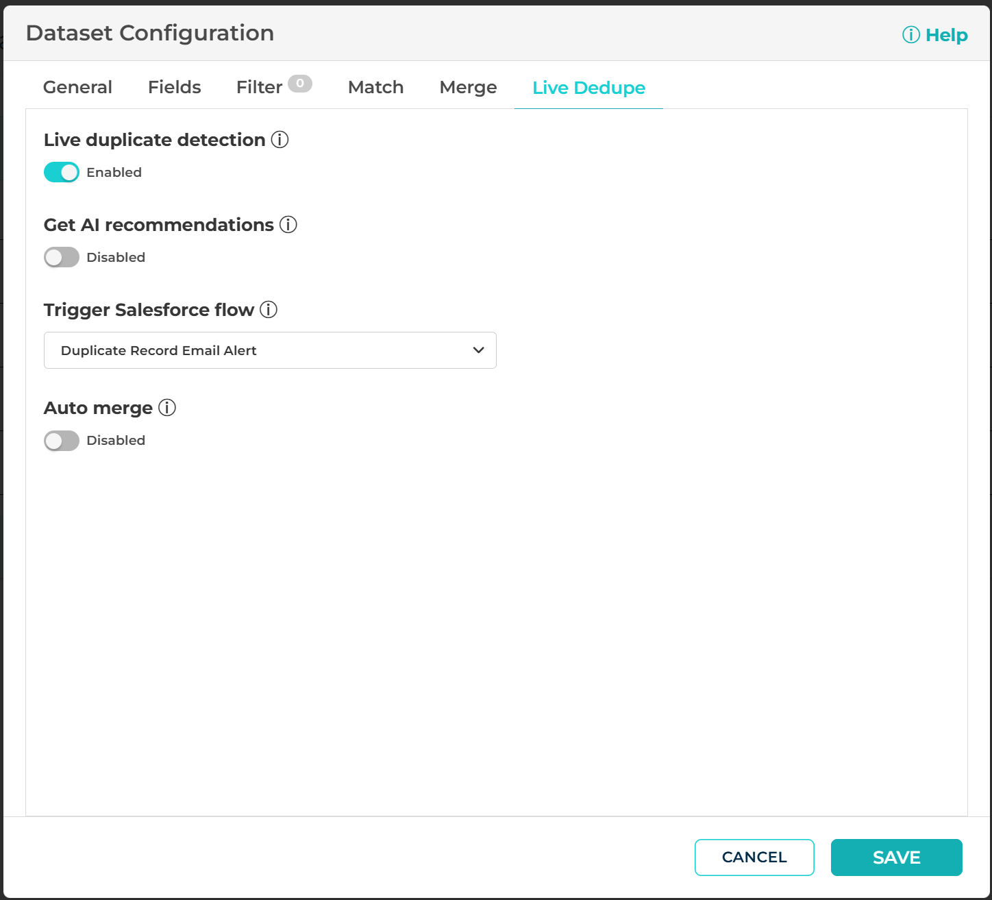 This tab allows you to name your dataset and select the Salesforce object that will be analyzed for duplicates.