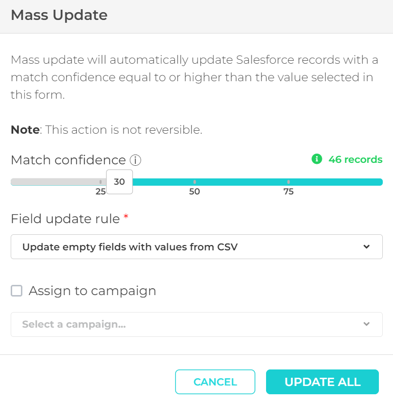 In the displayed window, use the dual match-confidence slider to set a minimum and maximum confidence range to use as the basis for the mass update. Then choose the preferred method for updating Salesforce record.