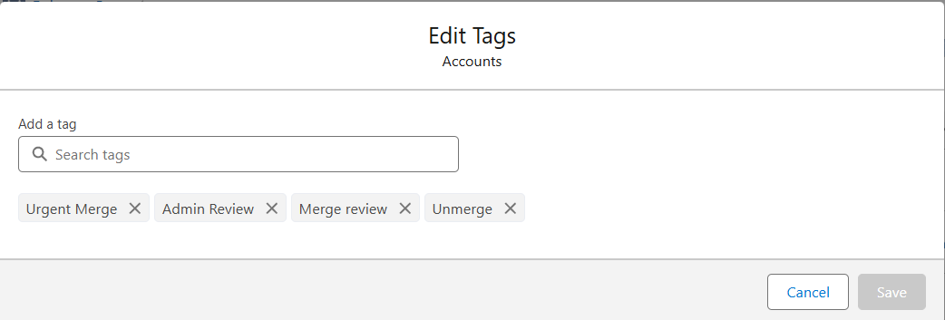 When merging or unmerging records within Salesforce, users can access the same shared tag library available in DataGroomr — ensuring unified tagging across both environments.
