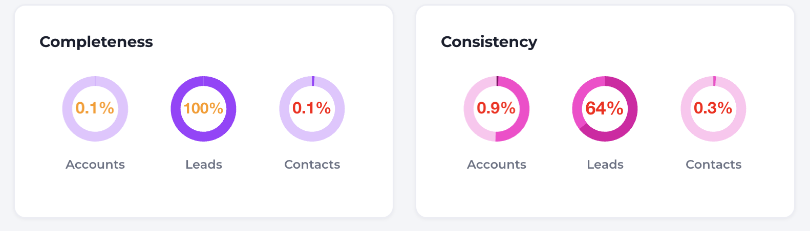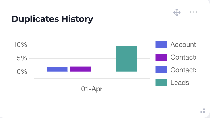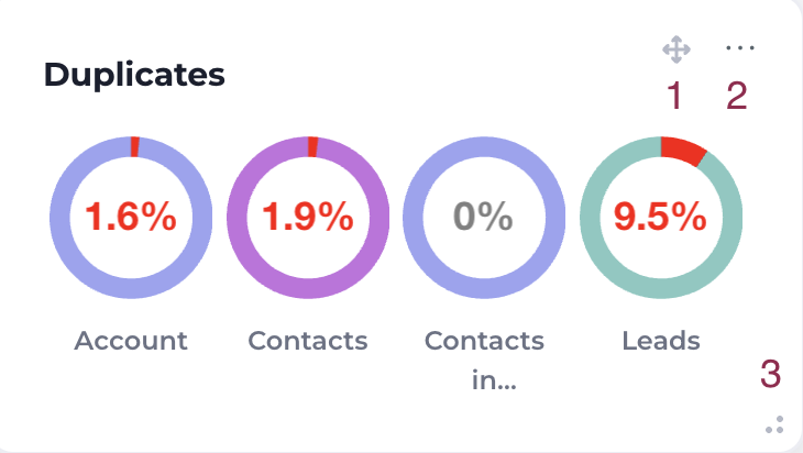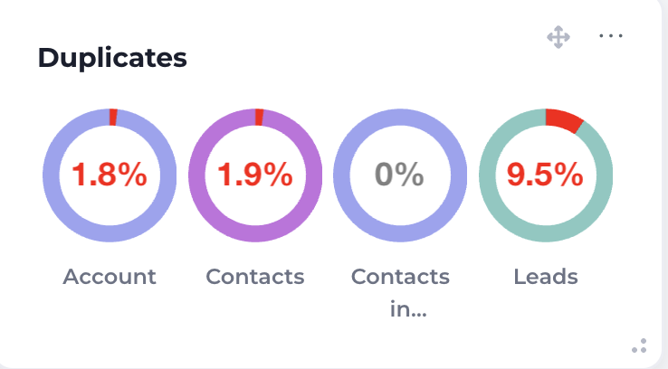 The duplicates summary component shows the live percentage view of duplicates within a Salesforce org. The larger the red portion of the ring, the higher the percentage of duplicates. Customizing the component changes the datasets being analyzed